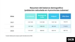 En la publicación “Indicadores Demográficos de Cuba y sus territorios 2023”, del Centro de Estudios de Población y Desarrollo (CEPDE), adscrito a la ONEI, una entidad estatal subordinada al Consejo de Ministros, se muestra en el resumen del balance demográfico que el país tenía una población calculada al cierre de 2020 de 11 millones 181 mil 595 habitantes, que fueron disminuyendo a 10 millones 885 mil 341 (2021); 10 millones 428 mil 733 (2022) y 10 millones 55 mil 968 (2023), esta última, una cifra similar a la de 1985.