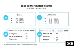 Por otro lado, aunque según los datos oficiales, la tasa de mortalidad infantil habría descendido de 7,6 en 2021, a 7,5 en 2022 y 7,1 en 2023, en algunos territorios se registra muy por encima: Camagüey (10,8), Isla de la Juventud (9,3), Mayabeque (9,1) y Guantánamo (9,0), las más altas del país el pasado año.