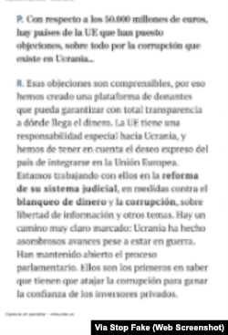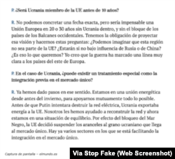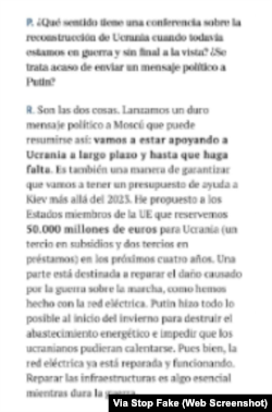No obstante, Ursula von der Leyen no hizo tales declaraciones, sus palabras fueron sacadas fuera del contexto y malinterpretadas. La entrevista del 22 de junio, concedida a cinco medios europeos durante la estancia de la eurocomisaria en Londres en una conferencia sobre los problemas de la recuperación de Ucrania, se convirtió en motivo para la manipulación.