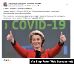 Algunos medios de comunicación rusos e internautas están difundiendo información de que la dirigente de la Comisión Europea, Ursula von der Leyen, supuestamente ha anunciado que Ucrania se convertirá en miembro de la Unión Europea sólo dentro de unos 20 o 30 años.