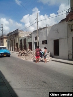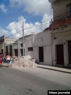 El reportero Juan Carlos Díaz muestra el estado en que se mantiene el frente de una casa situada en la calle Máximo Gómez entre Nazareno y Bertematti, del municipio de Guanabacoa donde ocurrió el derrumbe del techo hace varios días.