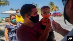 Un policía toma la temperatura a viajeros en un punto de control de coronavirus en La Habana. (AP Photo/Ramon Espinosa)